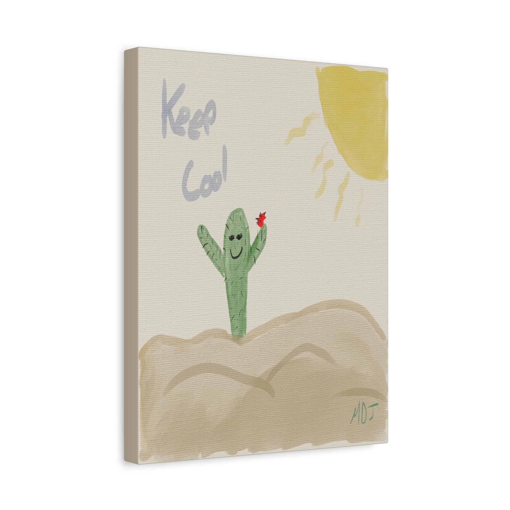 This playful artwork features a cheerful cactus, arms wide open, reminding us to "Keep Cool" under the sun's warm embrace. The simple yet charming design brings a lighthearted vibe, perfect for brightening up any space. With its friendly expression and vibrant colors, this piece invites a sense of joy and relaxation. A delightful addition to your collection, it’s sure to spark smiles and good vibes wherever it’s displayed.