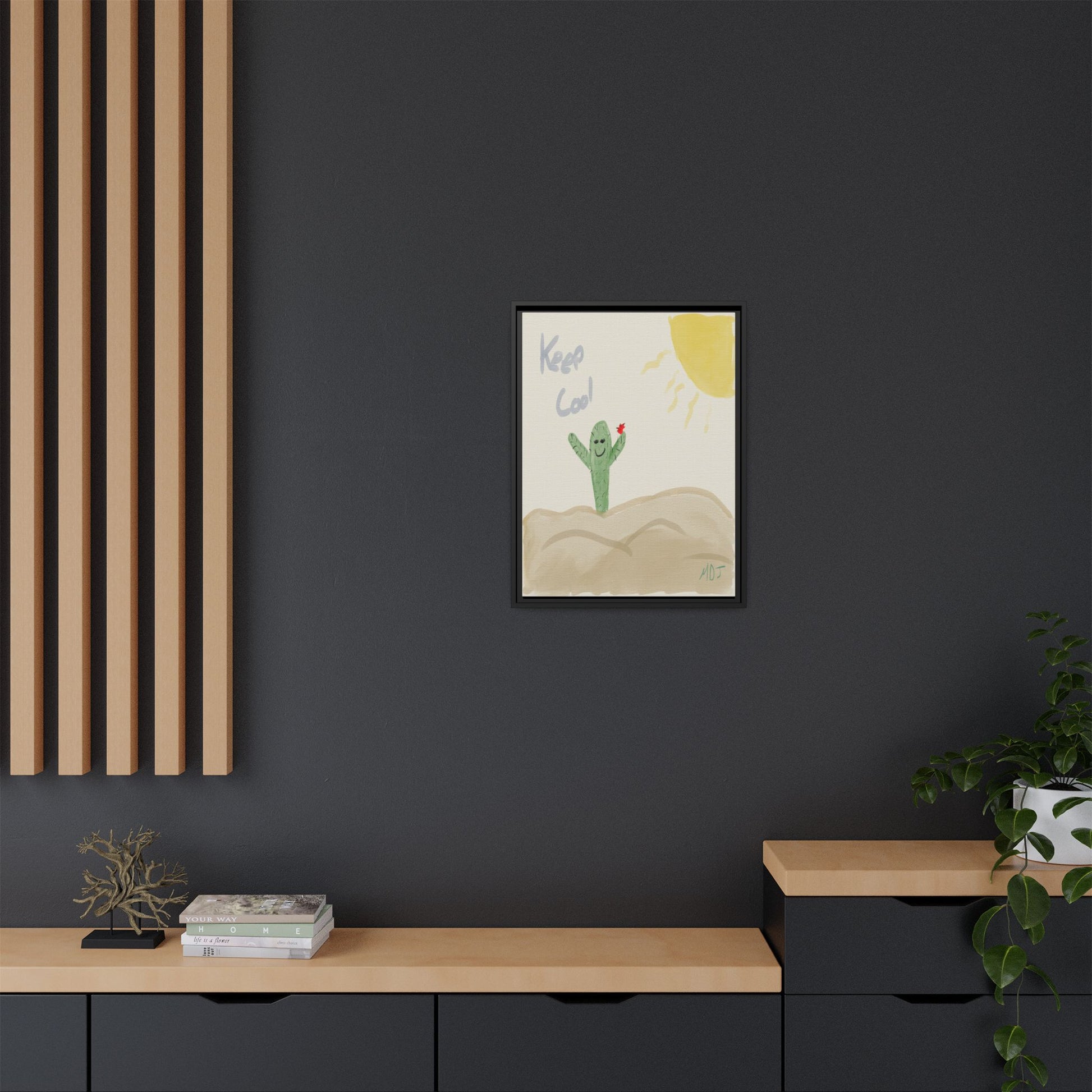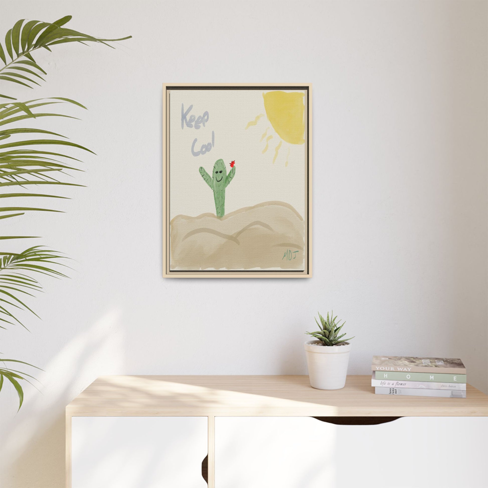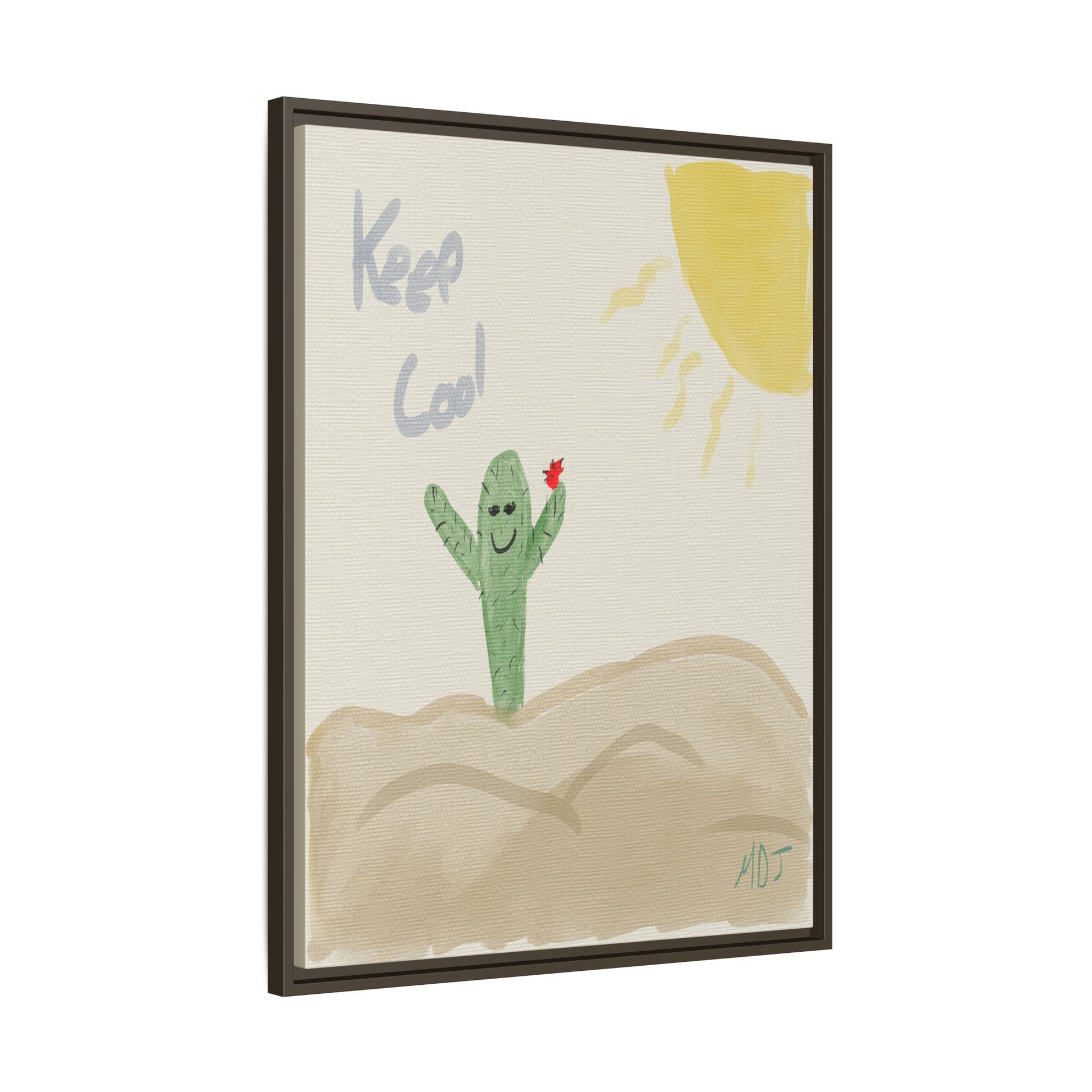 This playful artwork features a cheerful cactus, arms wide open, reminding us to "Keep Cool" under the sun's warm embrace. The simple yet charming design brings a lighthearted vibe, perfect for brightening up any space. With its friendly expression and vibrant colors, this piece invites a sense of joy and relaxation. A delightful addition to your collection, it’s sure to spark smiles and good vibes wherever it’s displayed.